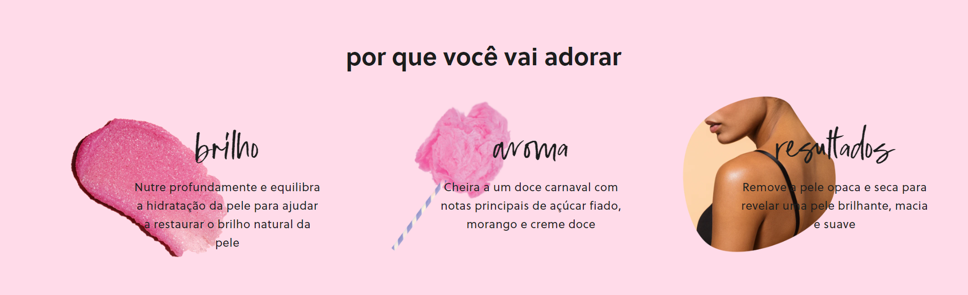 Melhore a sua rotina de banho, esfoliação durante o dia e revele uma pele macia e brilhante com o aroma divertido do Algodão Doce! Feito com açúcar, manteiga de karité, morango e uma variedade de óleos naturais como óleos de prímula, abacate, macadâmia, amêndoa doce, cártamo e laranja.