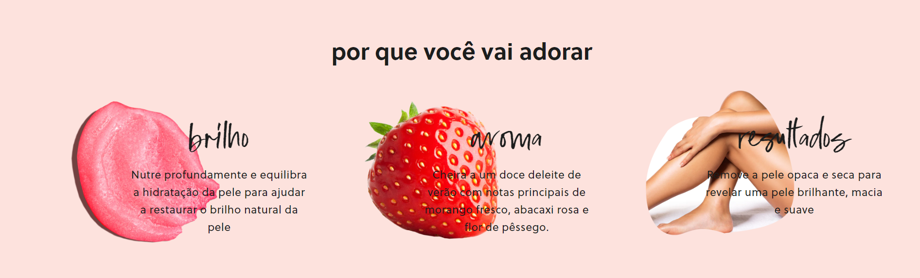 Aumente a sua rotina de banho, esfolia o dia e revele uma pele macia e brilhante com o delicioso aroma de Morango! Feito com açúcar, manteiga de karité, morango, ácido beta-hidroxi (BHA) e uma variedade de óleos naturais, incluindo óleos de prímula, abacate, macadâmia, amêndoa doce, cártamo e laranja.